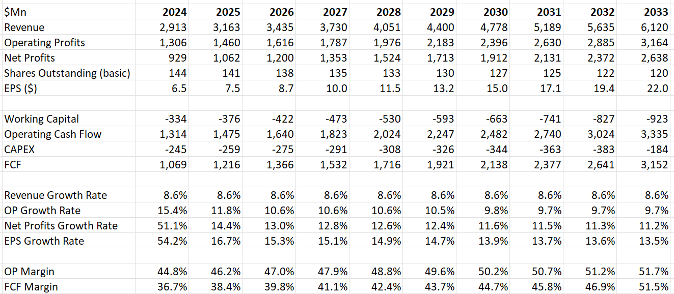 I forecast their operating expenses will grow by 6.8% annually, leading to operating leverage. The operating margin is forecasted to reach 51.7% by FY33 as per my calculations.