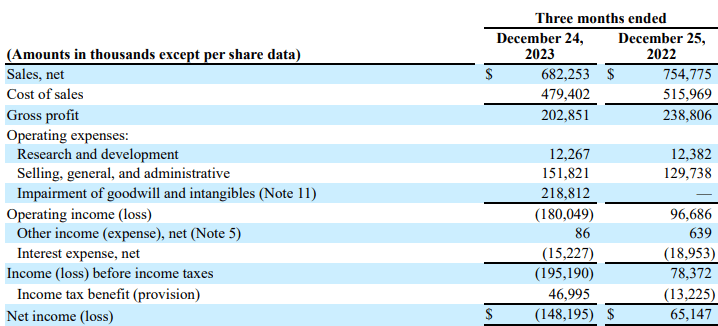 It incurred a goodwill cost of $218.8 million in Q3 FY24. So excluding this charge, the adjusted net income for Q3 FY24 was $48 million, which was $65 million in Q3 FY23. The numbers clearly show weakness. However, I think we might see better margins in the coming quarters because the freight costs are continuing to decline, which will lower its inventory costs. In addition, the management said that the purpose of giving higher discounts in this quarter was to work through its high-priced inventory, and it saw success. So we might see lower discounts in the coming quarters. But despite the higher margin expectations, I think we might continue to see weakness in the upcoming quarter due to low sales expectations. The management is expecting its FY24 sales to be around $2.77 billion, which is 10% lower than FY23 sales. So, the weak sales guidance can adversely affect its share price, and considering normalized channel inventories, we might see weakness in the sales growth.