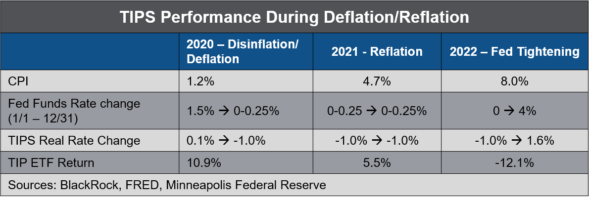 The table shows the behavior of inflation, the Fed funds rate, the TIPS real rate, and total returns for the TIP ETF (a reasonable proxy for TIPS returns). Initially, TIPS fared well, even though inflation declined in 2020 from an already quiescent 1.8% in 2019. TIPS' gain in 2020 was mostly due to the decline in the real rate from near zero to -1%, plus a modest coupon return.