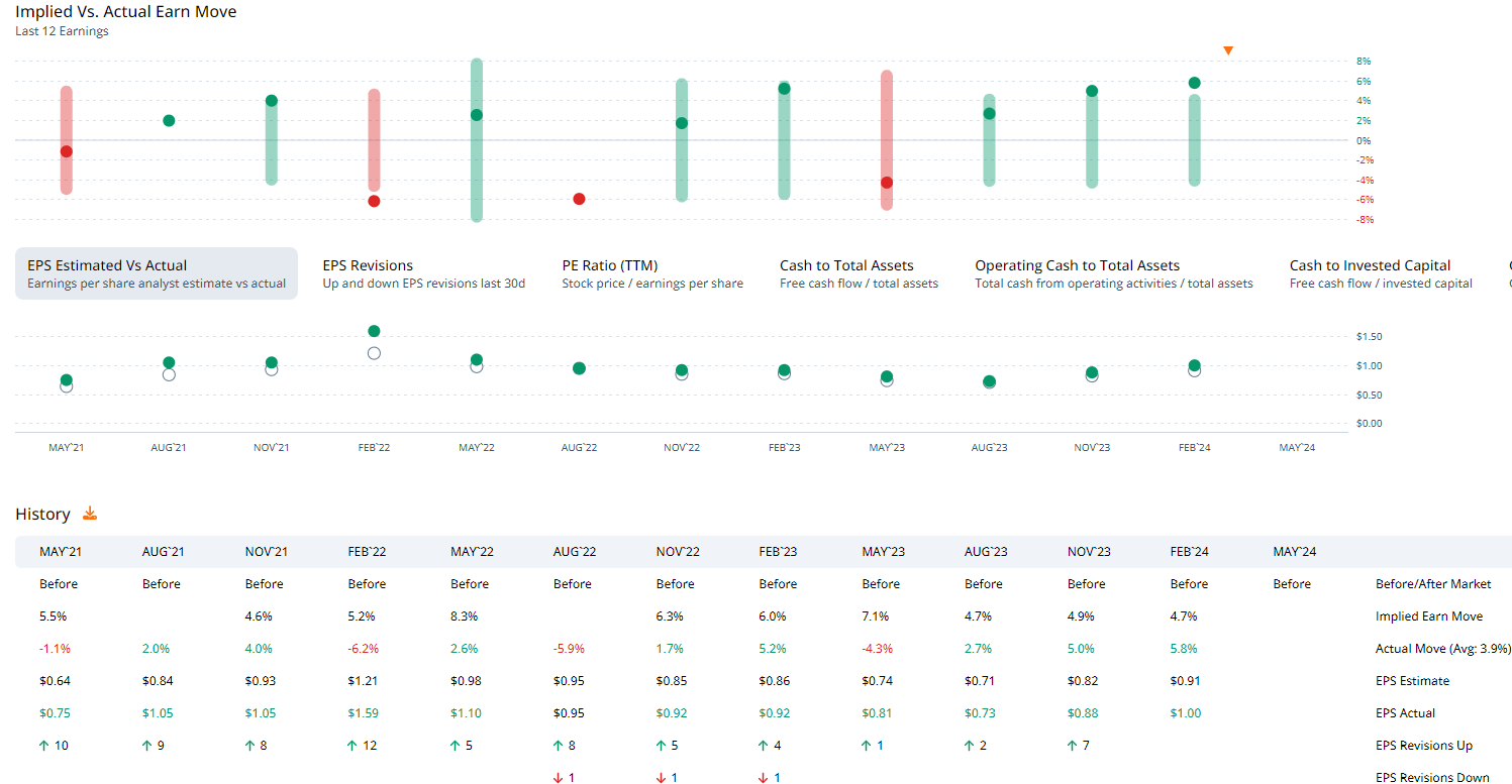 Data from Option Research & Technology Services (ORATS) shows an average actual move of 3.9% post-reporting, and while we don’t yet have a firmed up straddle pricing for the May 10 Q1 2024 release, expectations will likely be higher given the solid earnings run. Seeking Alpha reports that there have been a dozen EPS upgrades of KKR in the last three months.