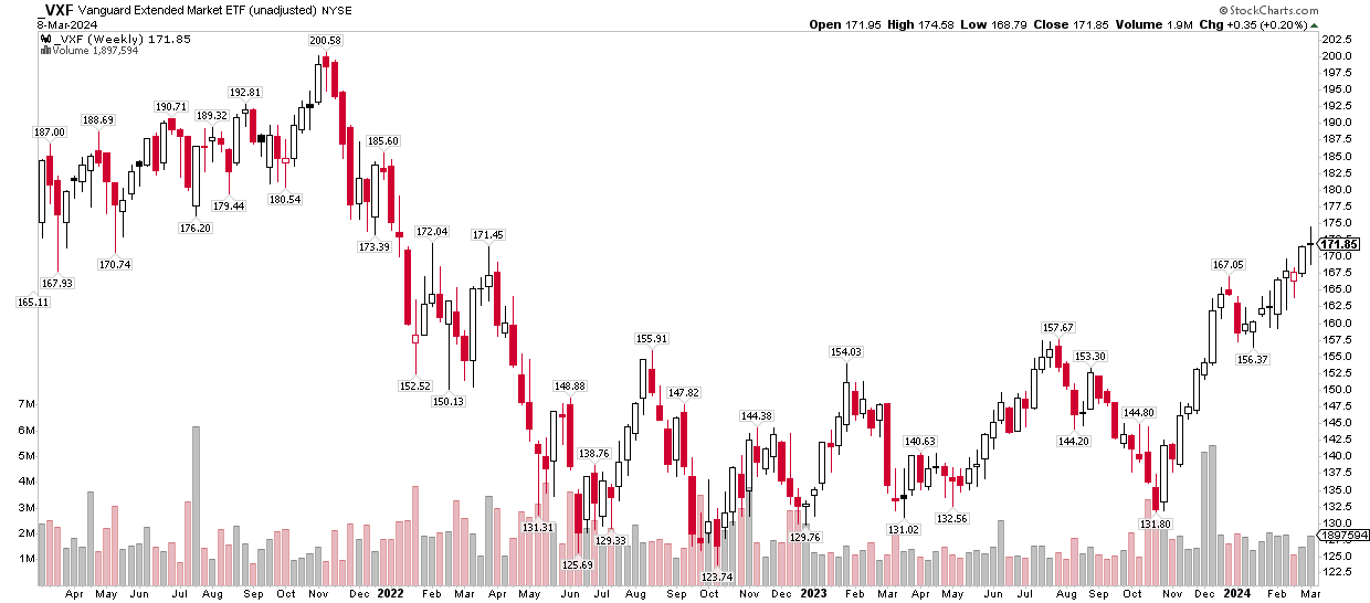 Investors often get caught up focusing on the S&P 500, but there is a world of stocks away from the domestic large-cap space. An overlooked ETF is the Vanguard Extended Market ETF (VXF). This is an all-inclusive SMID-cap fund – it houses all US stocks not technically classified as large caps. It includes many big-name companies such as CrowdStrike (CRWD), Snowflake (SNOW), Super Micro Computer (SMCI), and KKR (NYSE:KKR). VXF has broken out to fresh highs since early 2022 as the equity rally broadens.