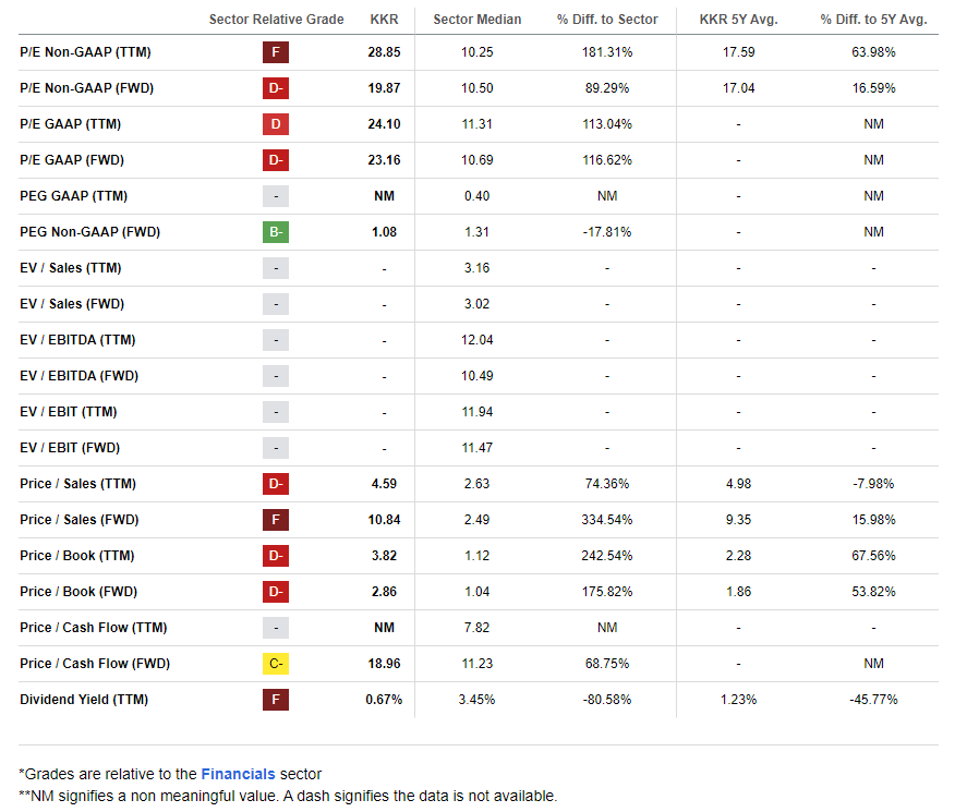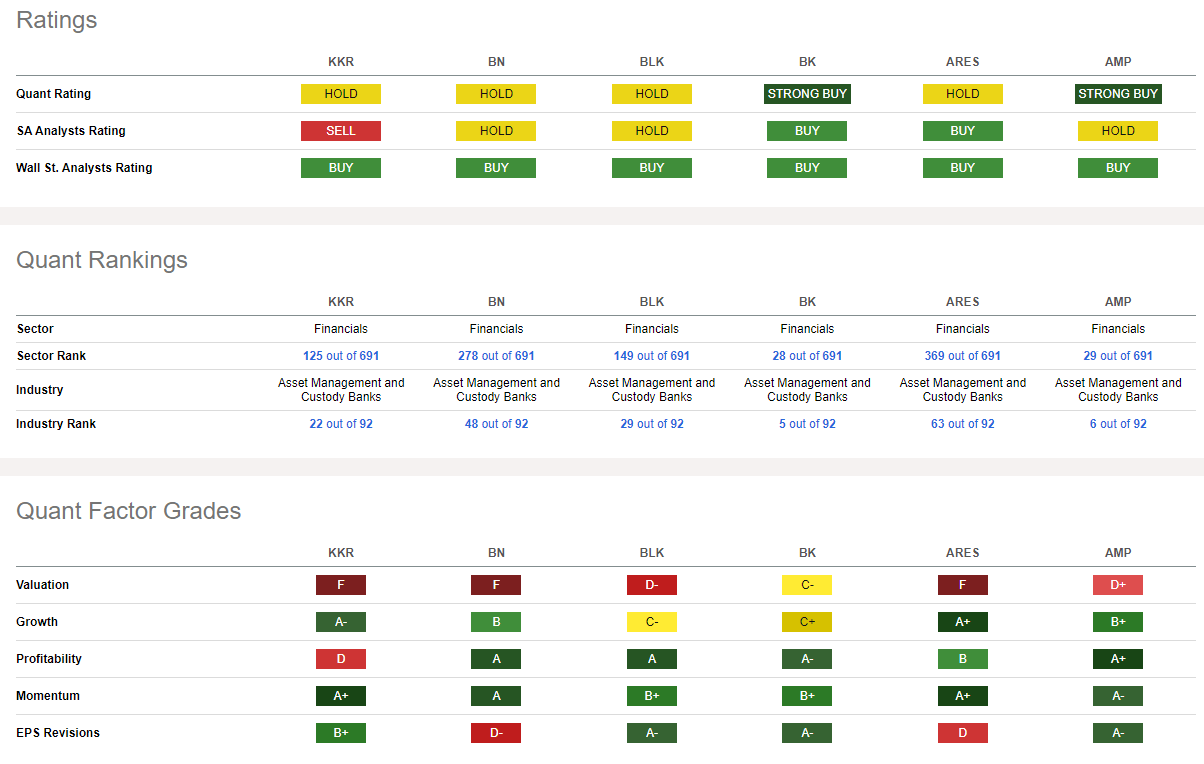 Compared to its peers, KKR features very high growth but a weak valuation grade, although I have demonstrated that the valuation is actually quite appealing when looking ahead. While profitability trends have been modest lately, a string of EPS beats is bullish for future earnings potential. Among the best momentum readings across the market, sellside analysts have turned much more sanguine on the stock via the B+ EPS Revisions grade.