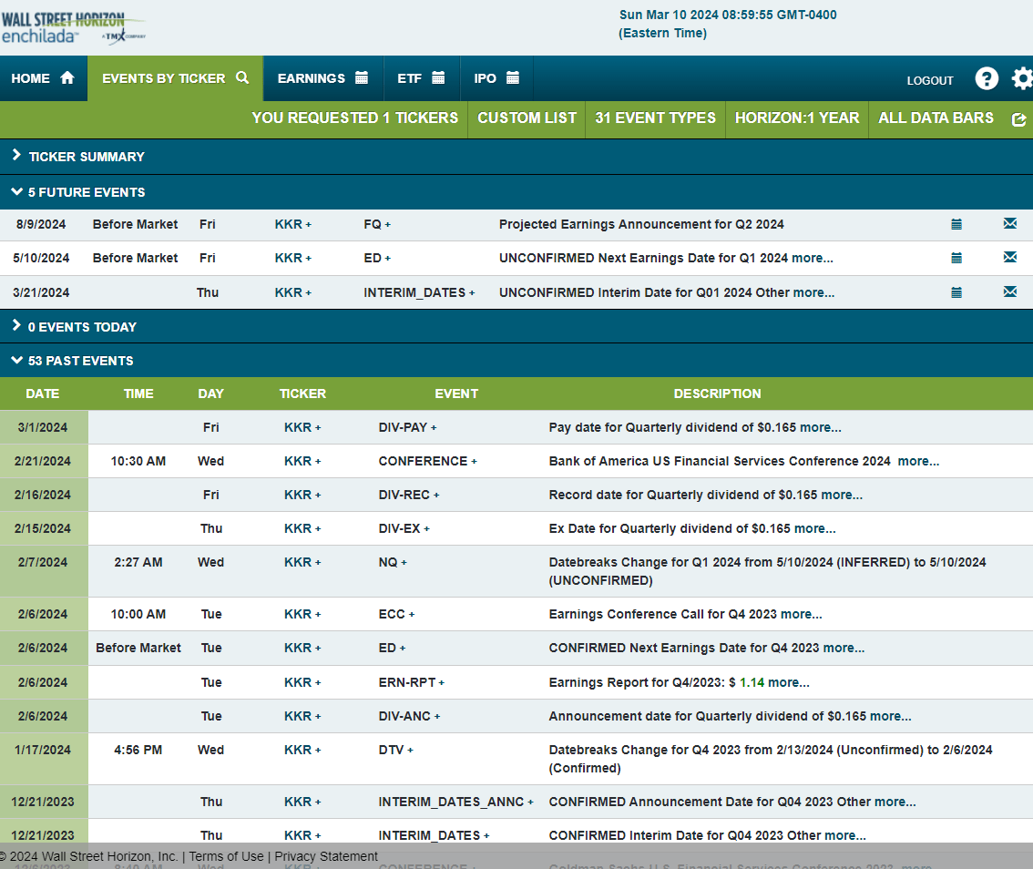 KKR has topped earnings expectations in each of the past 12 quarters. Its most recent quarterly report was exceptionally bullish. Per-share profits easily topped the Wall Street consensus estimate, and the stock rose more than 5% immediately after the February release, making it back-to-back strong reactions.