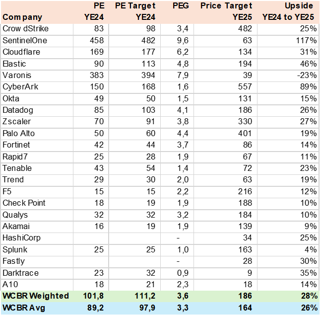 With estimated revenue growth of 17% and significant margin expansion, the consensus EPS estimate is over 28% in the YE24-25 period with YE25 EPS growth of 64% which supports the market's positive vision of the cybersecurity secular growth story and its high valuations. Note that many companies have moved from earnings losses to gains that distort EPS growth which I have adjusted from the calculations.