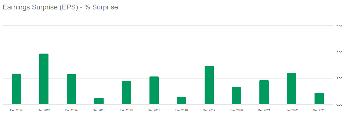Figure 1: WEC Energy Group (WEC): Annual GAAP and adjusted – where applicable – earnings per share figures since 2004 (WEC Energy Group February 2024 Investor Book) Figure 2: WEC Energy Group (WEC): Adjusted EPS surprise in percent (Seeking Alpha)
