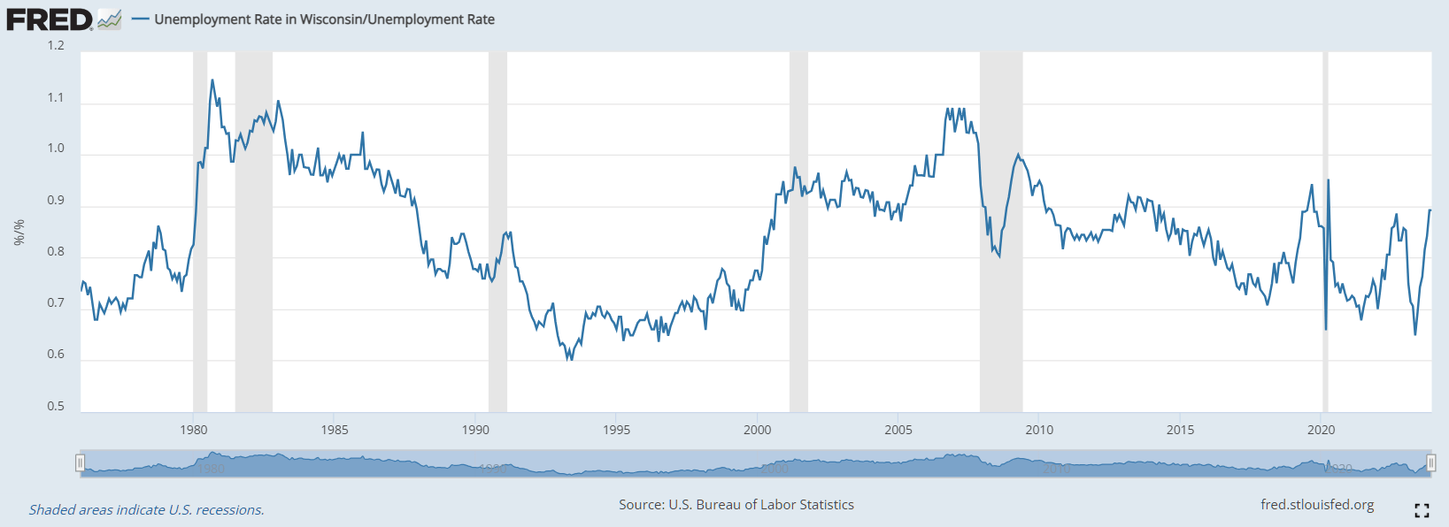 Figure 4: U.S. Bureau of Labor Statistics, Unemployment Rate in Wisconsin divided by the national unemployment rate WIUR/UNRATE (retrieved from FRED, Federal Reserve Bank of St. Louis)