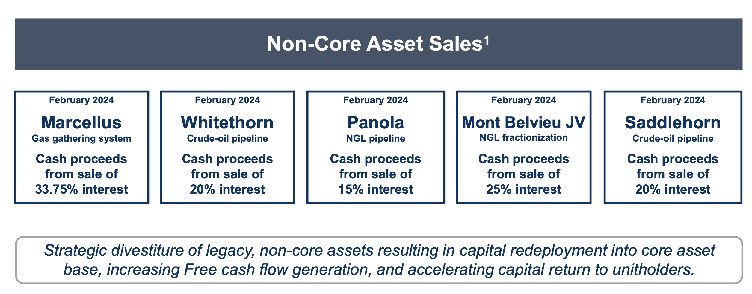 The company's non-core asset sales have enabled it to raise almost $800 million as it sells non-controlling stakes. The company is redeploying this capital and given its large current size, we expect it to continue to look at strategic divestitures such as these. The company's strong history of unit repurchases also reenables it to leverage this cash received.