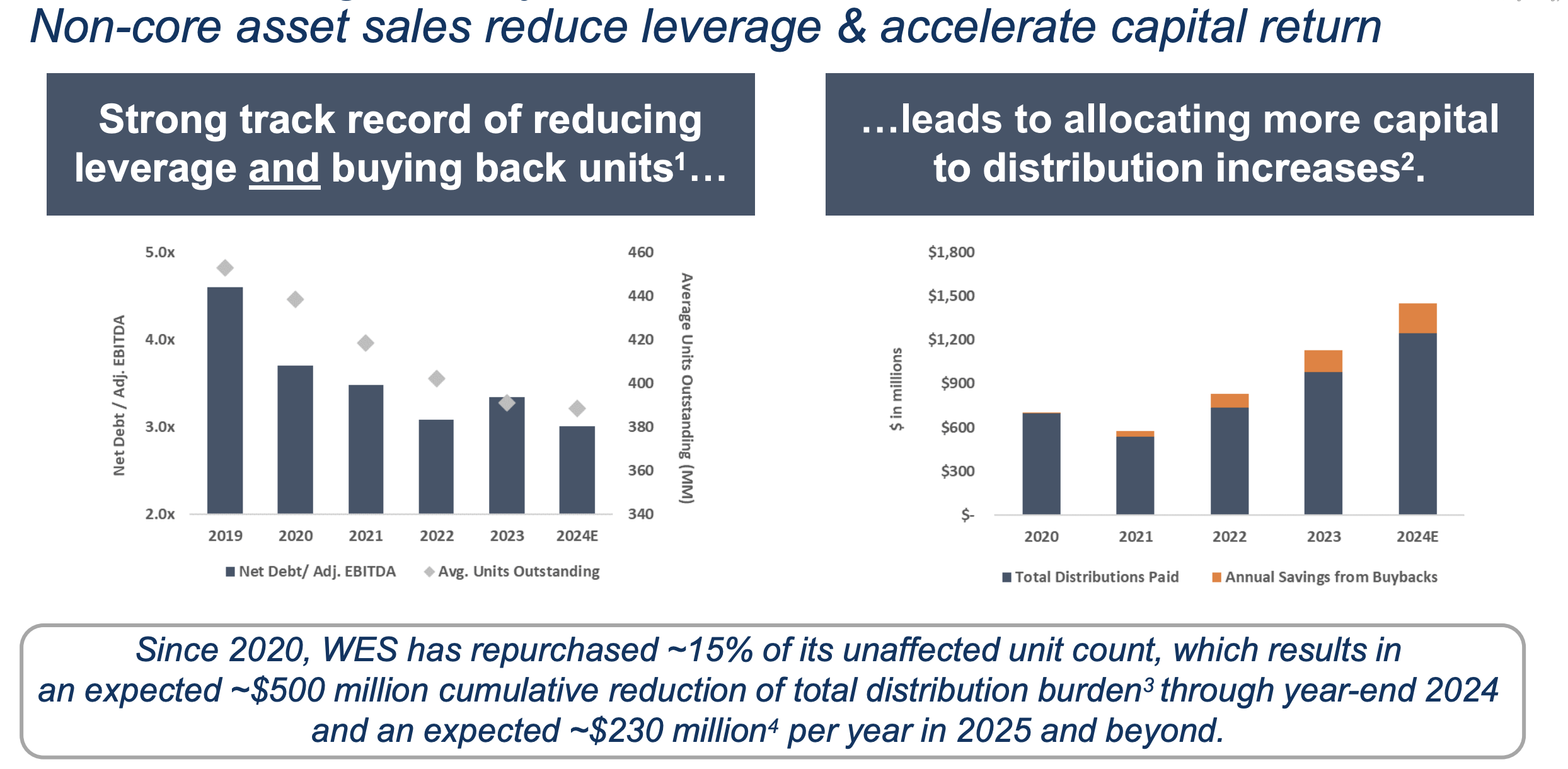 The company has managed to consistently reduce its leverage, and now has its net debt to adjusted EBITDA sitting at 3.0x, a level that's very comfortable for a midstream company given the reliable cash flow. That has enabled the company to put more cash towards share buybacks, and since 2020 it's repurchased a massive 15% of its unaffected unit count.