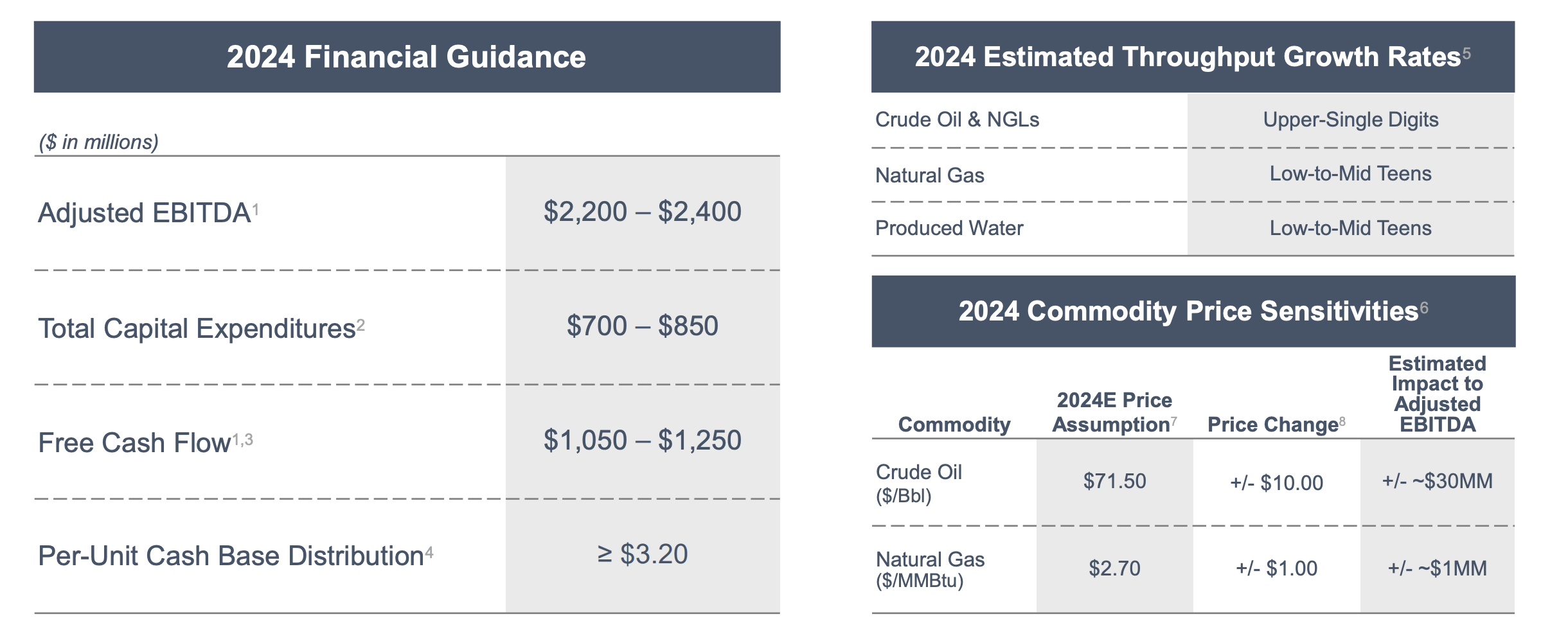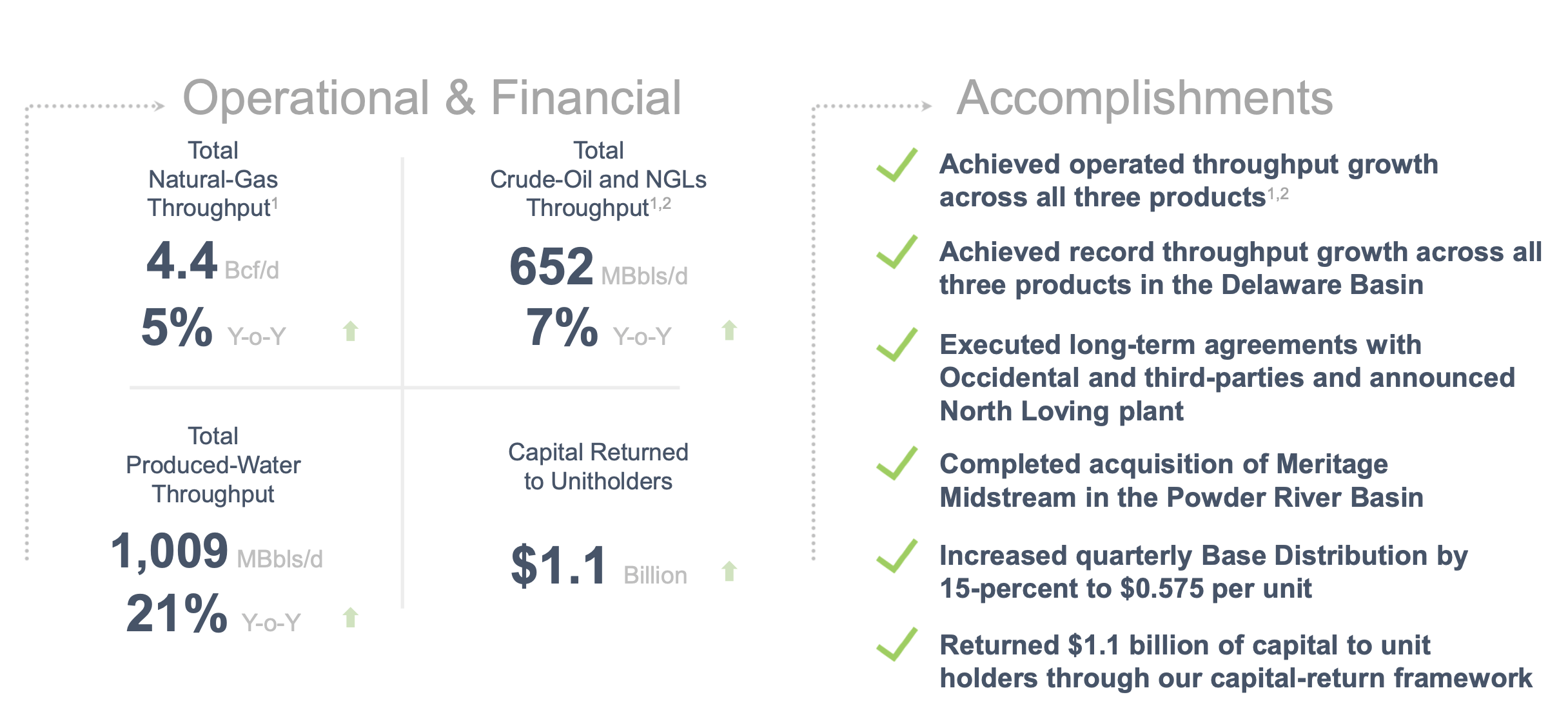All of this is backed by double-digit growth rates in natural gas and produced water volumes and almost 10% growth in crude oils and NGLs. The company's cash flow is remarkably reliable. The company's base distribution will be almost 10%, and we expect the company to both pay its strong dividend and repurchase shares.
