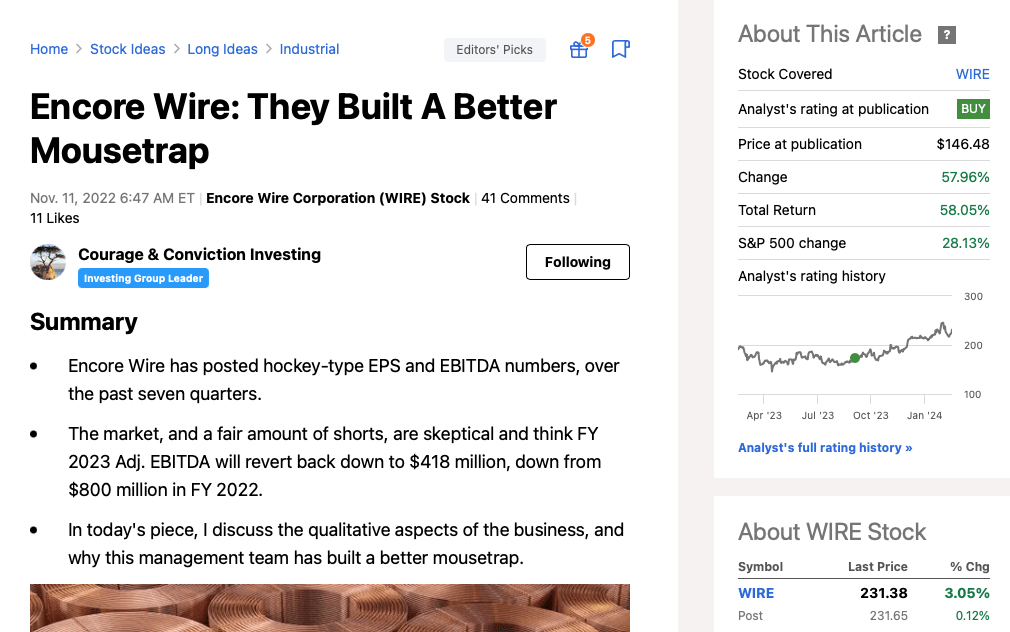 On November 11, 2022, exclusively here on Seeking Alpha, I penned my original piece on Encore Wire (NASDAQ:WIRE): They Built A Better Mousetrap.