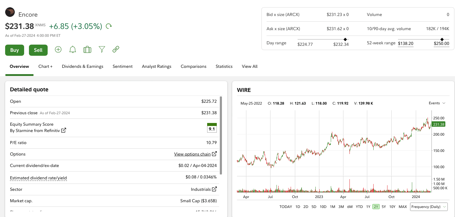 As of February 15, 2024, and per WIRE's FY 2023 10-K, there are 15,763,916 shares of WIRE in existence. Long time and super smart CEO, Daniel Jones, is long roughly 740K shares.