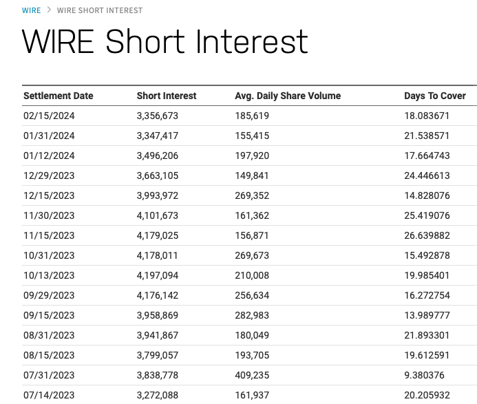 As of February 15, 2024, and by the way I intentionally waited for 2/15/24 data to be published, and it was last night, there are still a remarkable 3,356,673 shares of WIRE sold short!