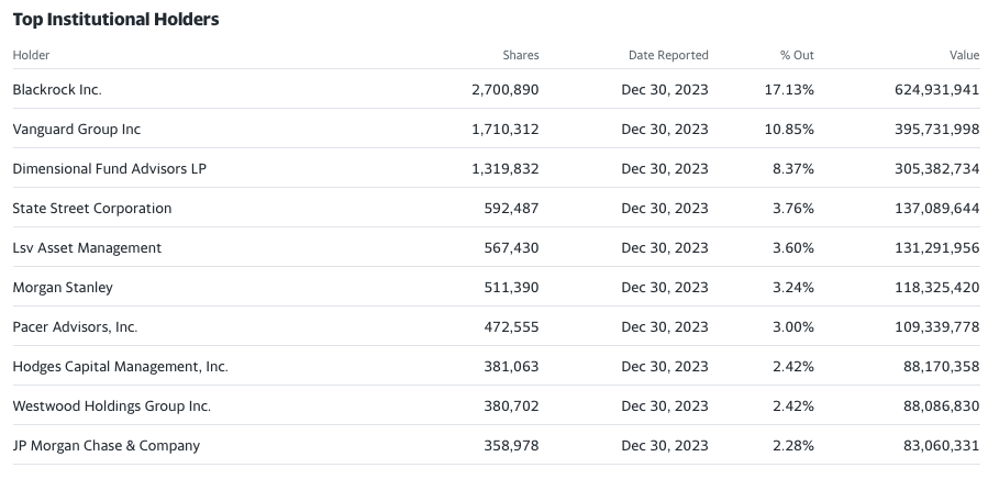 As of December 30, 2023, passive ETF holders, Blackrock Inc., Vanguard Group Inc. and State Street Corp. are collectively long roughly 5 million shares.