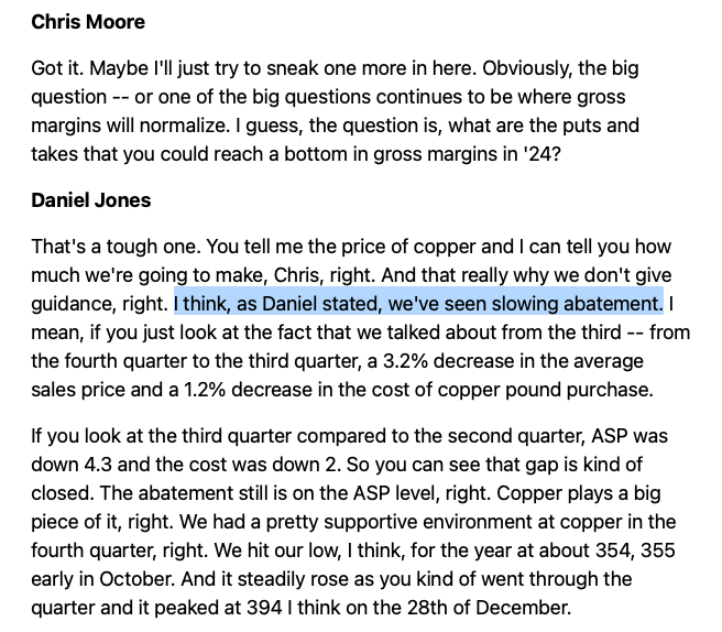If people that actually dig in or that get in the weeds and that do real fundamental work then they will quickly work out that copper spreads (the inherent gross margins between the price of commodity and WIRE's realized finished good selling price) peaked in 2021. Despite copper spreads contracting from those nose bleed levels (record gross margins), WIRE has taken material market shares and grown its volume nicely. Look no further than its recent 19% volume growth, in Q4 FY 2023. What are the shorts thinking after seeing those market share gains?