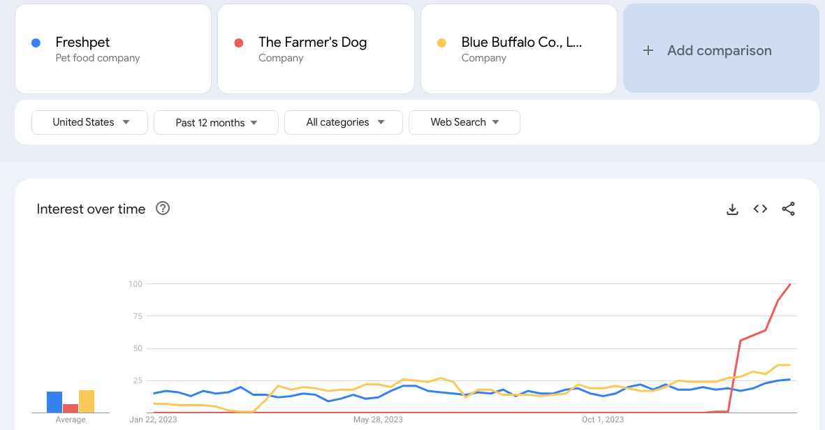 Will Freshpet be able to reach its 2027 goals? Since selling pet food is a commodity business, let’s examine competition. Freshpet’s plan is to justify premium pricing by convincing prospective buyers that Freshpet is better for pet health. This isn’t true. Another problem is that they aren’t the only company making this pitch. Two competitors who also are trying to reach health-conscious consumers are The Farmer’s Dog and Blue Buffalo. Let’s review Google Trends to see which brands are doing a better job at generating awareness.