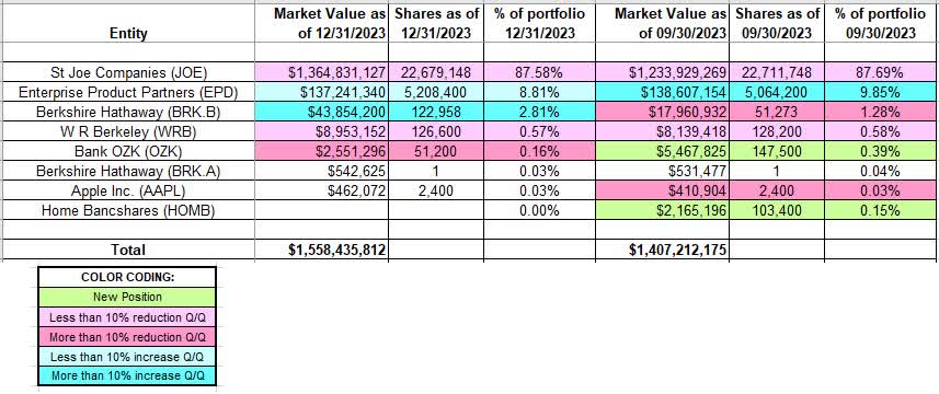 The spreadsheet below highlights changes to Fairholme’s 13F stock holdings in Q4 2023: