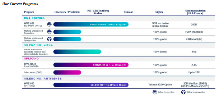 In Duchenne muscular dystrophy, Wave is testing WVE-N531 in the FORWARD-53 clinical trial. The company anticipates data ("dystrophin protein expression from muscle biopsies at 24 weeks") in the third quarter of this year. This figures to be a major event for Wave, but, again, there is very tough competition in DMD (e.g., Sarepta, NS Pharma, Pfizer, REGENXBIO), and it is a complicated disease.