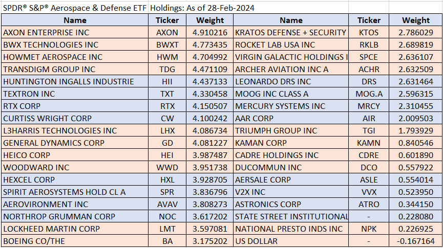 As shown above, in addition to U.S. stocks, its other main holdings come from developed markets like France and the U.K. since it tracks the S&P Developed BMI Select Aerospace & Defense 35/20 Capped Index. Also, the ticker symbols of European stocks suggest that they are not listed on the NYSE or the Nasdaq.