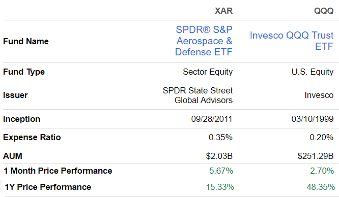 In a world of increasing geopolitical tensions and wars, investing in companies that produce weapons and related systems sounds like a good idea. For this purpose, the SPDR S&P Aerospace & Defense ETF (NYSEARCA:XAR) has outperformed the AI-driven Invesco QQQ Trust ETF (QQQ) in the last month, as shown in the comparison table below. Most of the upside occurred in the last week of January 23 and coincided with an intensification of hostilities in the Red Sea when American and British military forces started to defend maritime traffic against attacks by Houthi rebels.