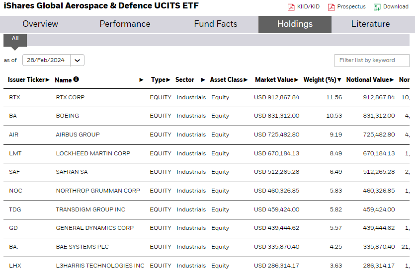 Now, to satisfy investor demand for related assets, at least three ETF issuers including one by BlackRock (BLK) have launched aerospace and defense sector-focused investment vehicles. Looking at one of them is the iShares Global Aerospace & Defence UCITS ETF listed on Euronext Amsterdam whose main holdings are listed below.