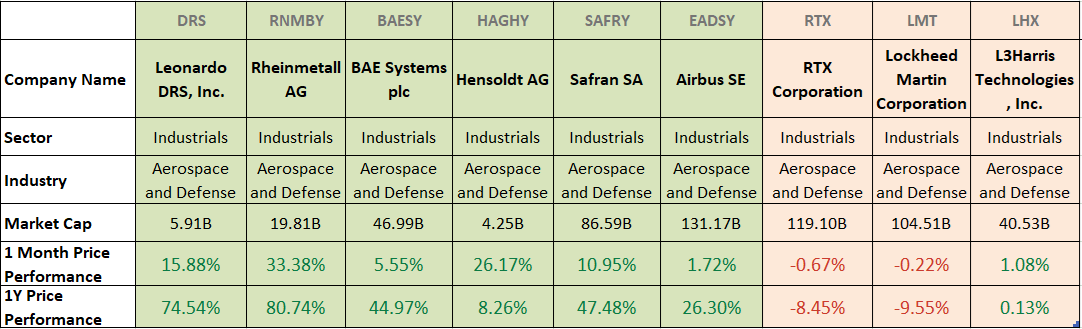 Looking at their U.S. public listings, these European companies to which I have added Hensoldt AG (OTCPK:HAGHY) from Germany have outperformed their American peers both in the short and longer terms as tabled below.