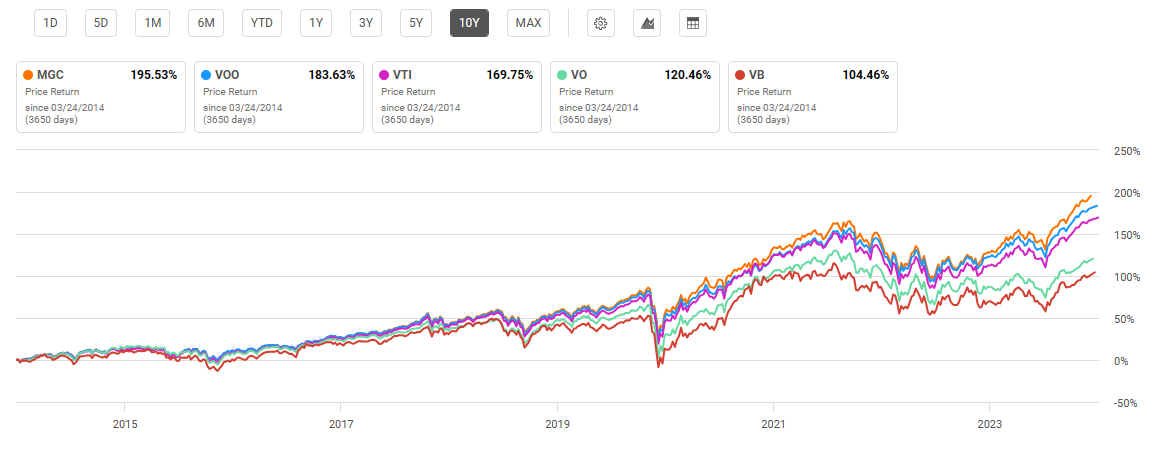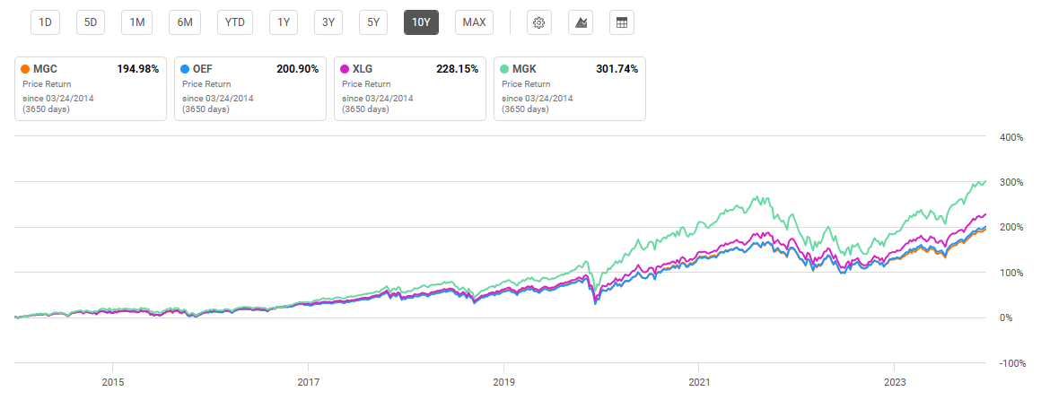 10-Year Total Price Return: MGC and Compared Mega-Cap Exchange Traded Funds (Seeking Alpha)