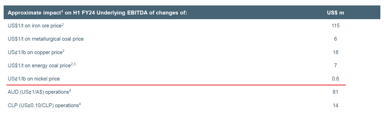 The latest nickel spot prices have been around $7.70/lb. Let's suppose nickel doubles overnight. Based on the company's sensitivity chart, that would be incremental EBITDA of $462 million. Yet the latest half-year report shows $13.9 billion in EBITDA, so doubling nickel's price will increase BHP's bottom line only by about 3%.