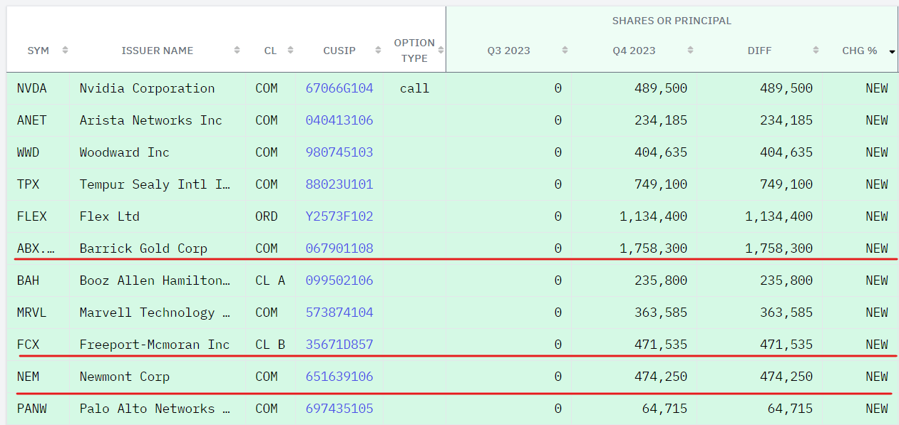Smart money also appears to have been adding mining stocks. For example, Stanley Druckenmiller's Duquesne seems to have added Barrick Gold (GOLD), Freeport-McMoRan (FCX) and Newmont (NEM):