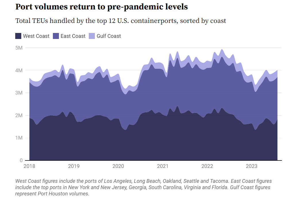 We see the same normalization when it comes to ports. Volumes in ports shot up in 2021 and 2022, leading to much maligned delays and congestion. Those numbers have finally come down to levels seen in 2019. This should increase the efficiency these companies can operate with, but again we feel that these gains may already be baked in at this point.