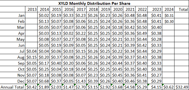 With the risk-free rate of return projected to decline in the 2nd half of 2024, I think there will be a focus on recreating yields that investors were accustomed to generating and that XYLD could become more appealing in the income investor community. I am long XYLD as part of an overall income strategy mix as it's produced over a decade of monthly distributions.