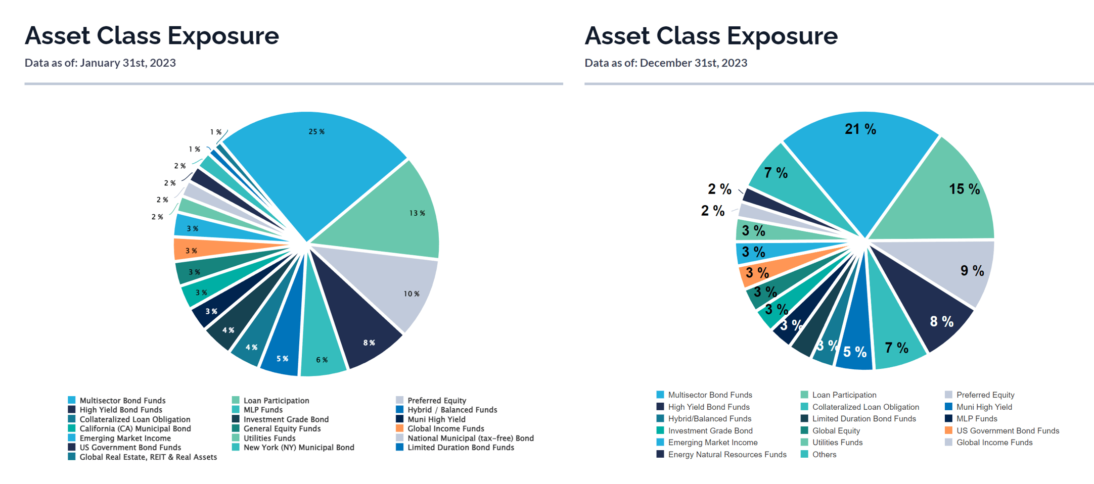 Asset class allocations have also been fairly consistent, with only small changes in individual asset class weights such as a decrease in Multi-sector Bond funds from 25% to 21% and an increase in CLO funds from 4% to 7% (Figure 3).