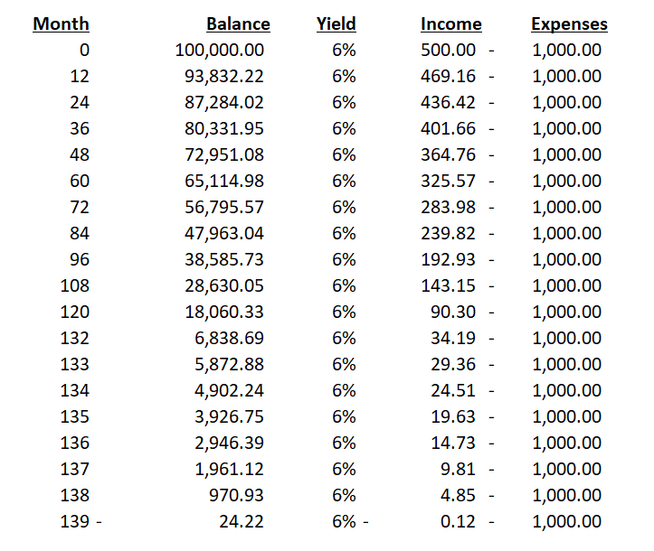 To see how this could be problematic, consider a real-life example. Assume John Doe has a retirement portfolio of $100,000 that is invested in securities earning 6% p.a (similar to what YYY has earned over 10 years). However, John has fixed monthly expenses of $1,000 (or 12% p.a. at inception, similar to YYY's fixed $0.12 / month distribution).