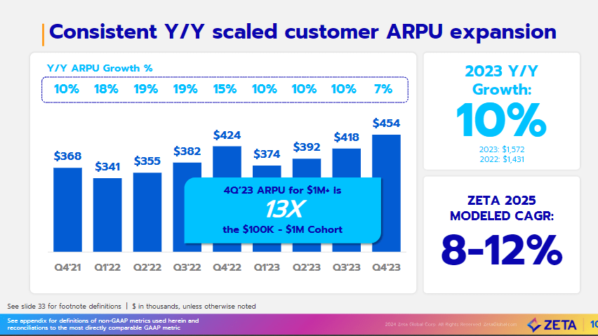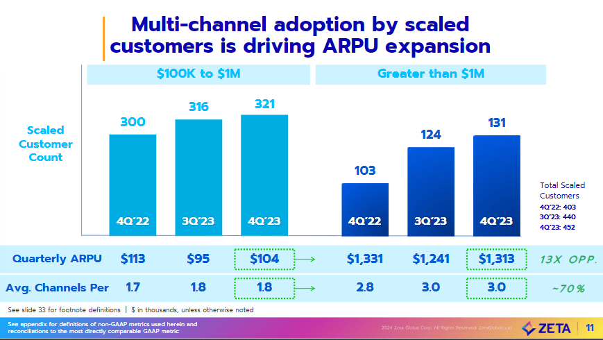 In 4Q23, ZETA added 12 new scaled customers, bringing the total to 452. This growth was driven by strong new logo growth. This set of performances is a lot better considering the underlying mix of customers that were added. When breaking down yearly growth in total customers, ZETA was most successful in the revenue range of over $1 million, where it added 7 customers sequentially and ended the quarter with 131. Zeta also added five new scaled $100k-$1 million revenue customers, ending 4Q23 with 321 scaled customers. This significantly pushes up the overall ARPU profile of ZETA's underlying customer base and also indicates that ZETA has a strategy for penetrating the upmarket. For reference, ZETA saw scaled customer ARPU improve 9% sequentially from $418k in 3Q23 to $454k in 4Q24, which is a 7.1% annual increase.