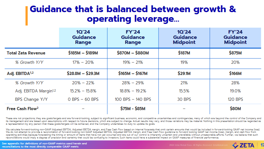 ZETA reported strong revenue growth of ~20% in 4Q23 to $210.3 million, ending FY23 with $728.7 million in revenue. The strong growth was driven by strong sales productivity, which led to healthy new customer adoption and ARPU expansion. While a gross margin of 60% came in below the 4Q22 level by 360 bps, mainly due to a mix shift away from direct platform revenue, adj. EBITDA margins actually improved by 280 bps from 18.5% to 21.3%. The better EBITDA performance was driven by strong revenue growth, which suggests ZETA is enjoying healthy operating leverage. On a GAAP basis, EPS came in at -$0.22, an improvement vs. 4Q22 of -$0.36. Although GAAP earnings were negative, ZETA still continued to generate positive FCF. 4Q23 saw ~$21 million in FCF generated, vs. $18.4 million in 4Q22. ZETA ended the year with a healthy balance sheet and net debt of ~$50 million.