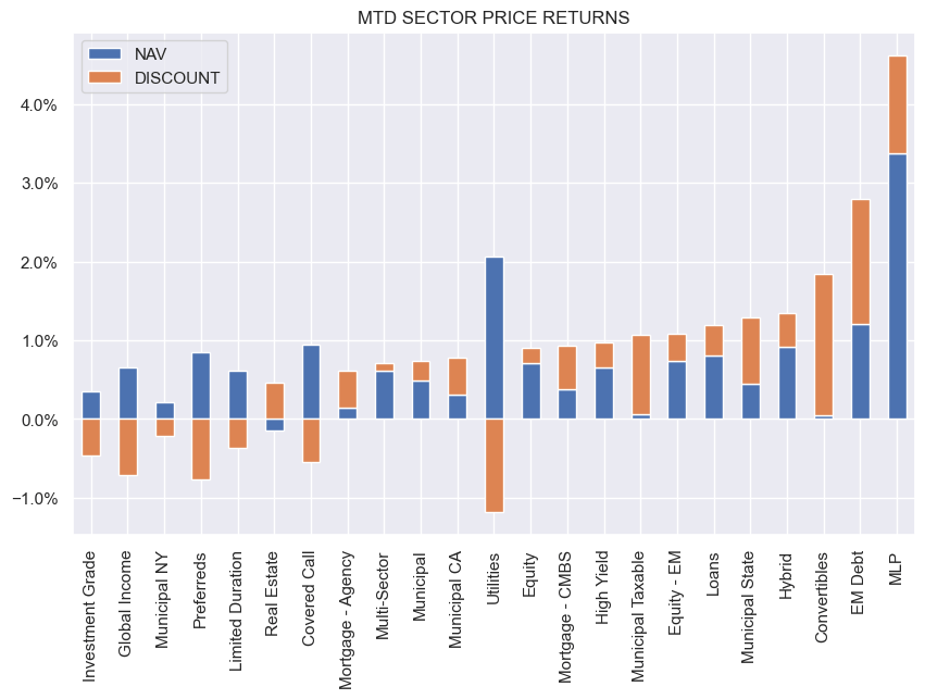Nearly all CEF sectors saw lower NAVs over the week due to the drop in stocks and Treasuries. MLP and loan CEFs eked out gains, however. Despite this weakness, discounts managed to tighten across all but 3 sectors. Month-to-date, most sectors remain in the green.