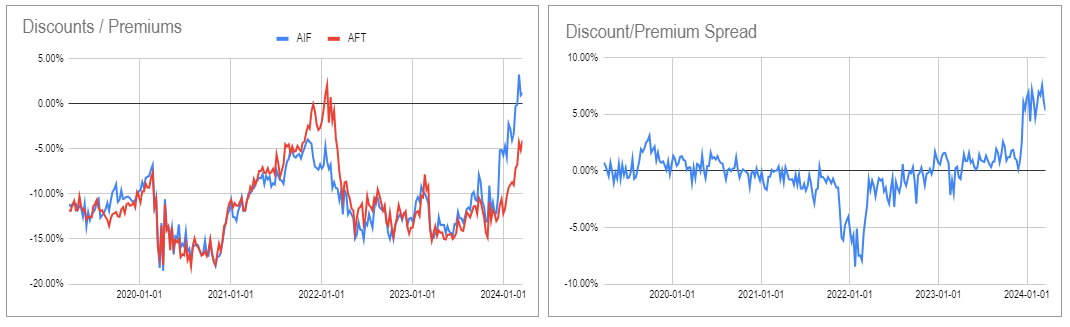 AIF is very expensive, trading at a small premium while AFT is a tad rich as well. Its 5-year discount percentile is 91%, meaning the discount has been tighter only 9% of the time in the last 5 years. Its DSSP or discount spread percentile is 85%, meaning the discount differential to the sector average has been tighter only 15% in the last 5 years.